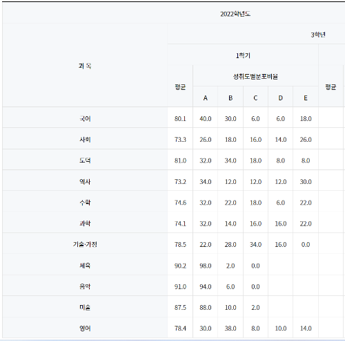 위 자료는 2017년도 국가 수준 학업성취도와 2021년도 진로현황을 바탕으로 만들어진 것이기에, 2022학년도 3학년 1학기 자료를 가져왔습니다. 역사와 사회에서 특히 어려움을 겪는 학생들이 많은 것으로 보입니다. 수학과 영어가 비교적 골고루 분포되어 있는 것으로 보아 학교 내신시험이 쉬운 편에 속할 것으로 보입니다. 영어 시험은 교과서 중심으로 출제되고 어휘 문제와 본문이해 문제가 많이 나온다고 합니다.
