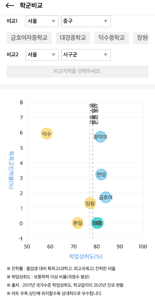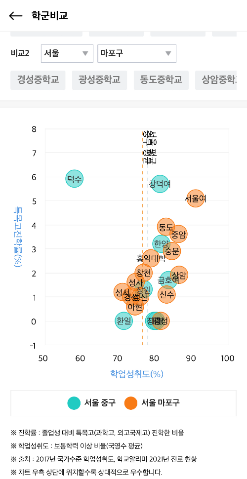 마포구 생활권이기도 해서 마포구와도 비교해 보니, 특목고 진학률이 0이고, 학업성취도도 70대 초반으로 낮은 편입니다. 차트의 우측 상단에 위치할수록 상대적으로 우수하다고 보면 되니 환일중학교는 주변에서 열성적으로 보내고 싶어 하는 학교는 아닌 편입니다.